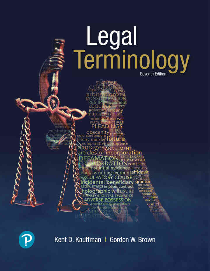More than 1,500 legal terms in context, with extensive practice Lively and easy to read, Legal Terminology introduces students to more than 1,500 legal terms, contextualized within the legal field. Styled like a workbook, the text promotes active learning through a concise, engaging presentation of narratives, definitions, study aids, and application activities. The 7th edition has been revised to improve accuracy and currency. It includes a new chapter on the Uniform Commercial Code, new material on e-Contracts and cyber law, and new features demonstrating the practical application of legal terms.Legal Terminology 7th Edition is written by Kent Kauffman; Gordon W. Brown and published by Pearson. ISBNs for Legal Terminology are 9780134871301, 0134871308 and the print ISBNs are 9780134849225, 0134849221. Additional ISBNs include 9780134871325.